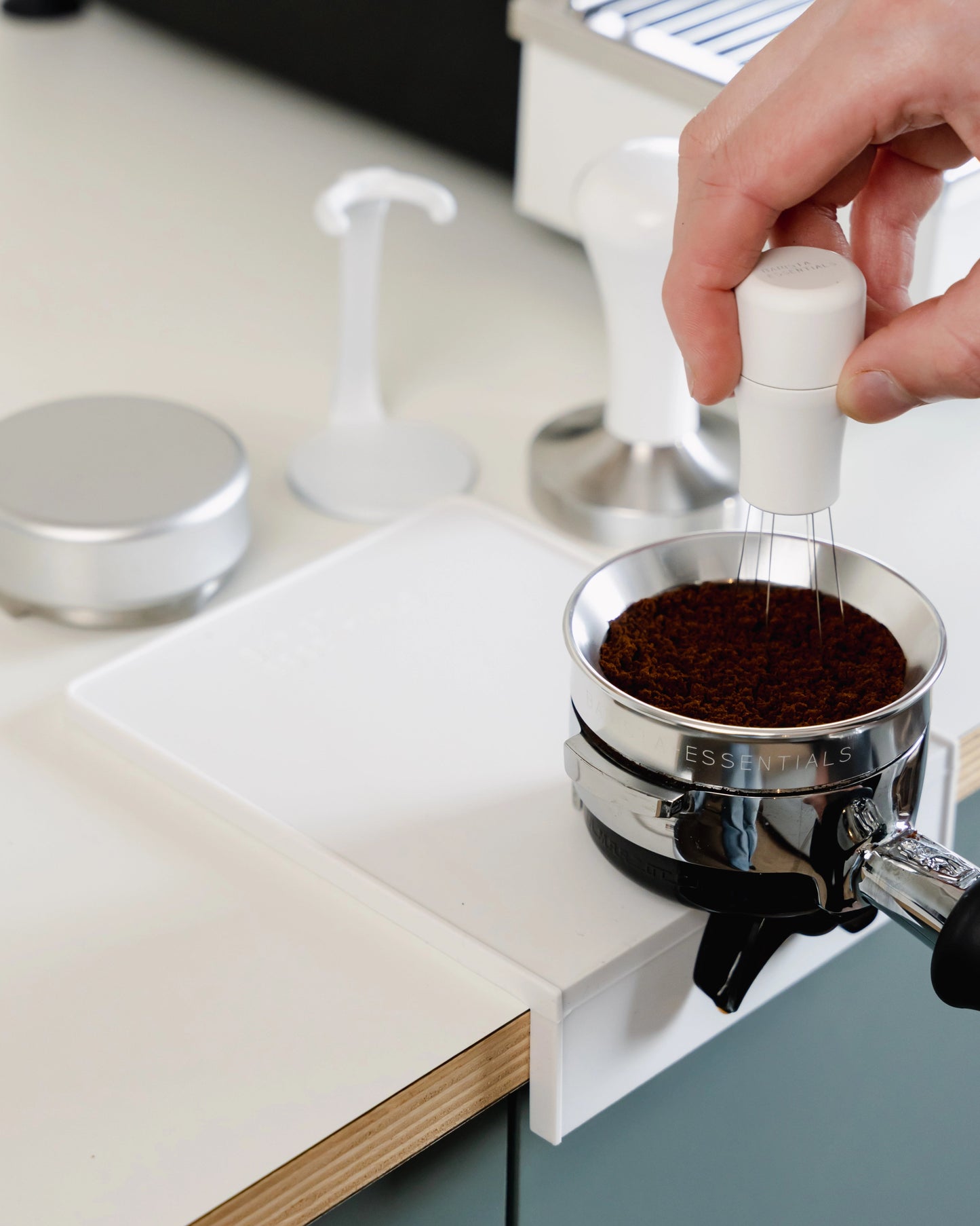So we at Barista-Essentials started looking for a solution. We found plenty of tamping mats in the strangest shapes, often with designated spaces for your tamper (as if you don’t have other barista tools).