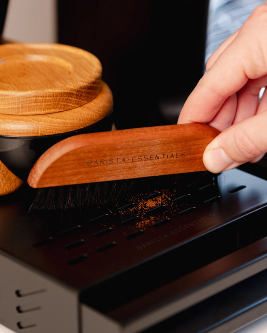 Mit einem Kaffeepinsel kannst du gemahlenen Kaffee, der neben deinem Siebträger landet, noch einfacher in die Schublade wischen. (Keine notwendige Aufwertung, aber stilvoll.) Schau dir hier unseren Kaffeepinsel an.