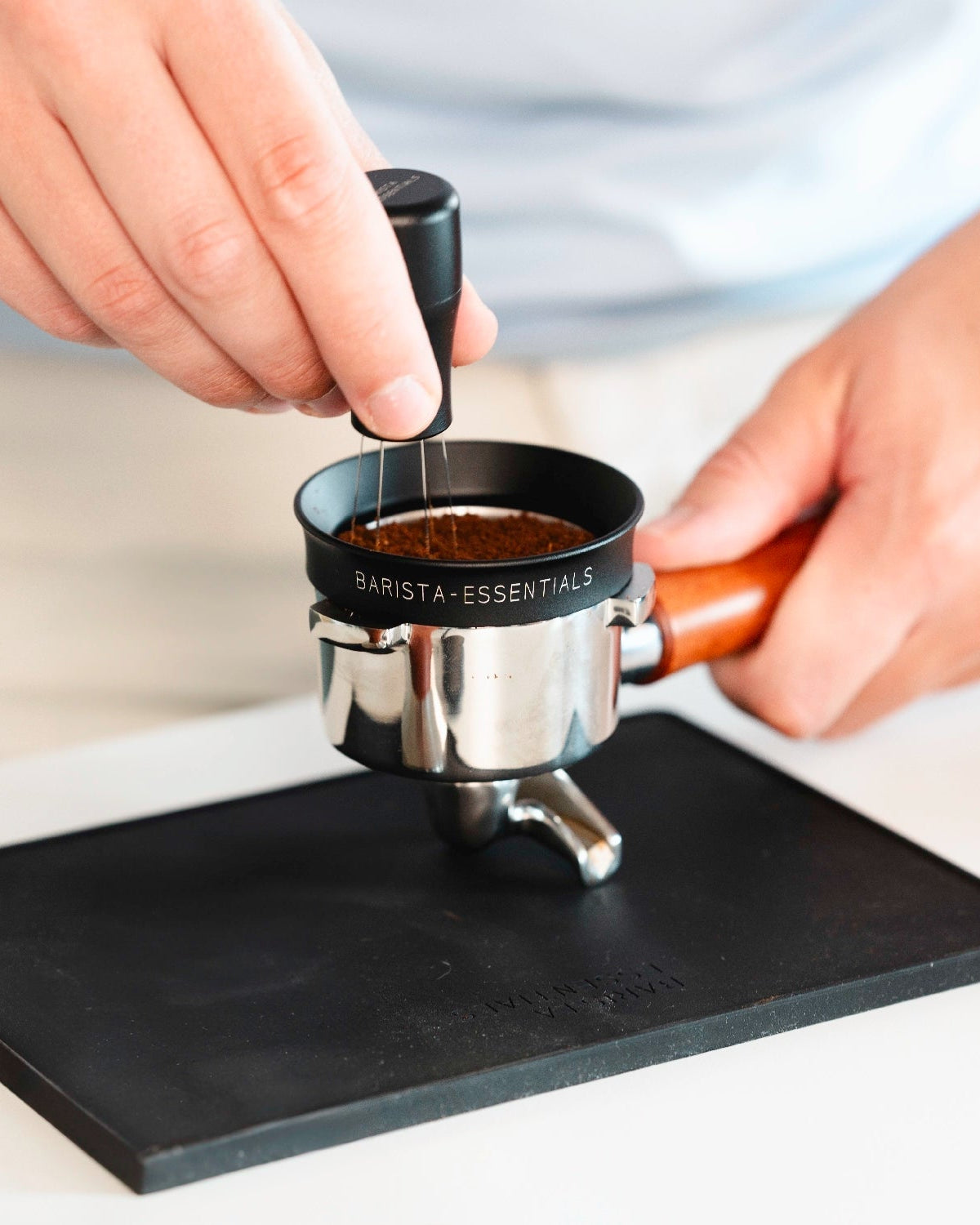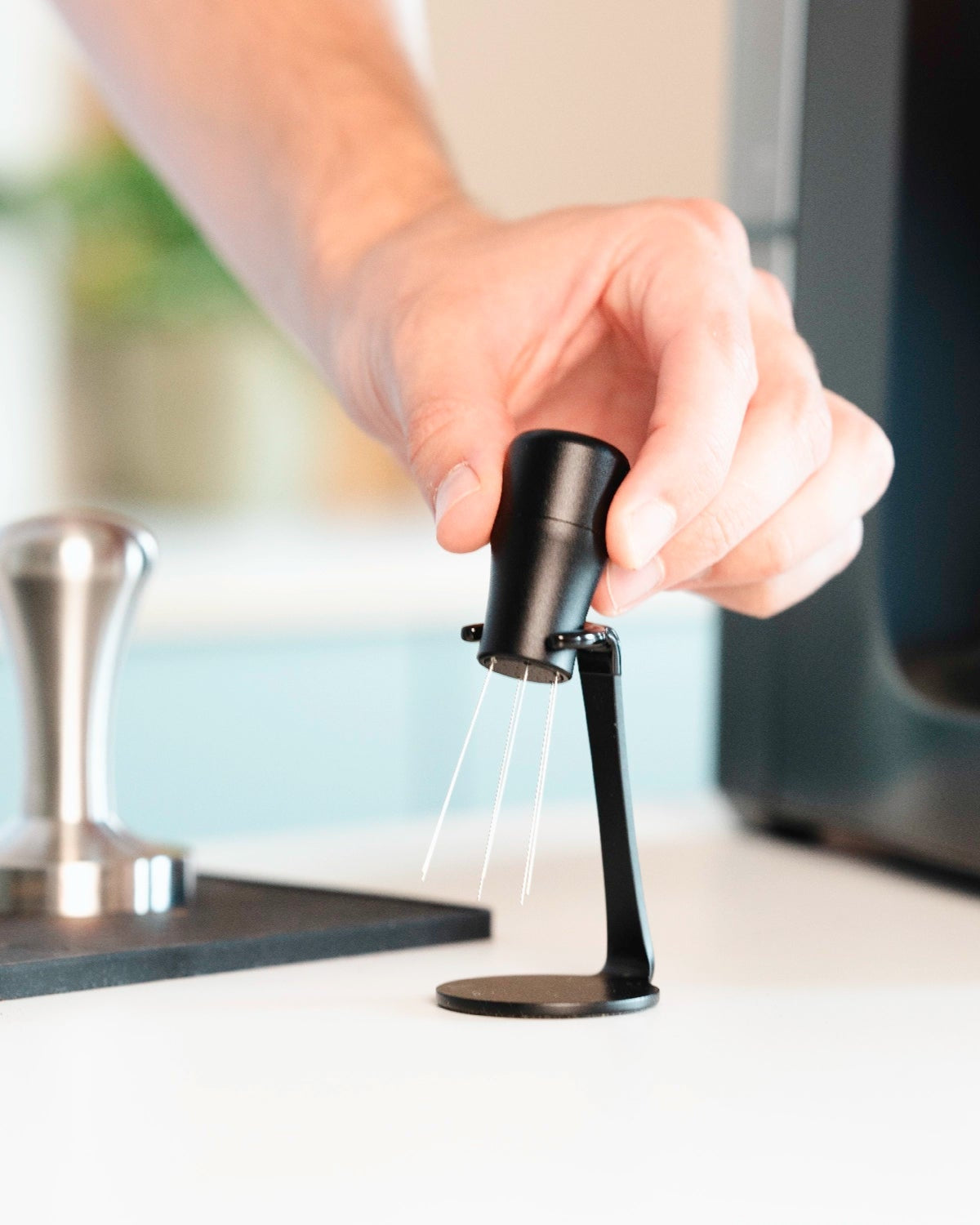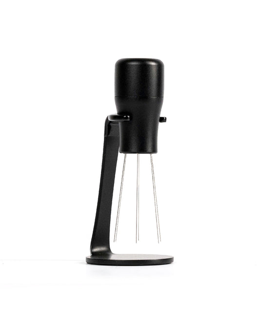 Nach dem Mahlen rührst du mit diesem Tool durch das Kaffeemehl (lass den Dosierring dabei ruhig noch drauf). So entfernst du Klümpchen und verteilst den Kaffee perfekt vor dem Tampen. Und glaub mir: Das macht einen größeren Unterschied, als du denkst.
