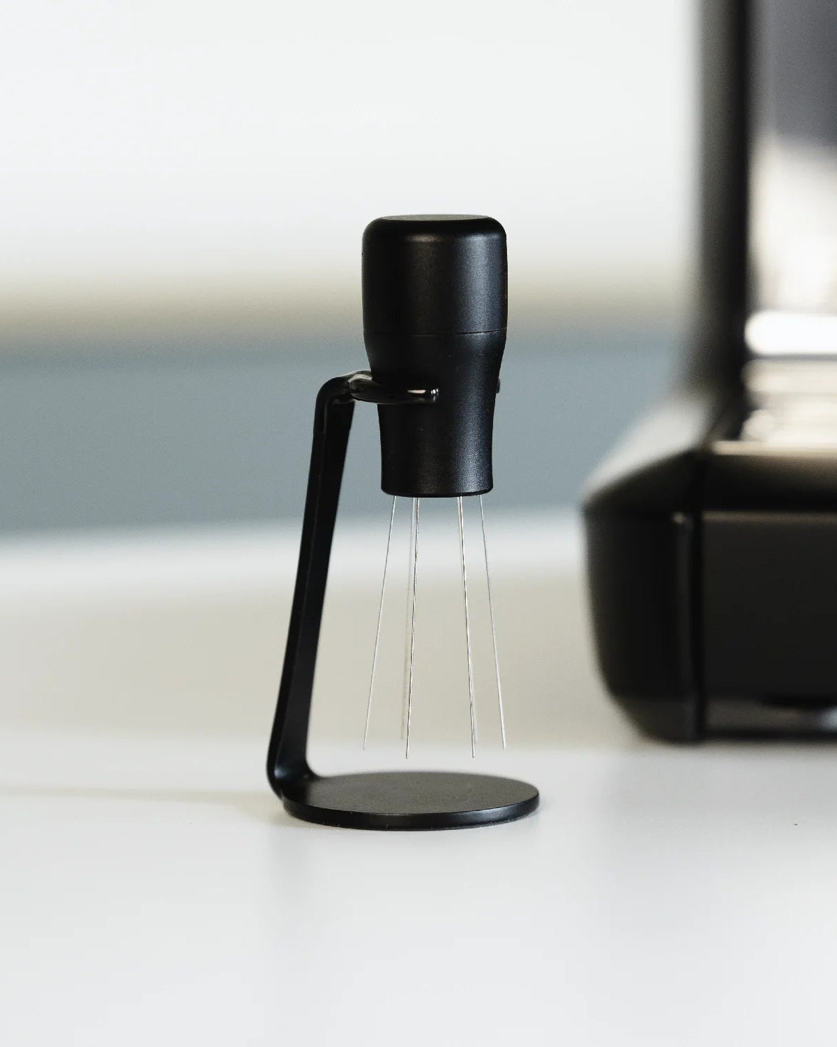 Nach dem Mahlen rührst du mit diesem Tool durch das Kaffeemehl (lass den Dosierring dabei ruhig noch drauf). So entfernst du Klümpchen und verteilst den Kaffee perfekt vor dem Tampen. Und glaub mir: Das macht einen größeren Unterschied, als du denkst.
